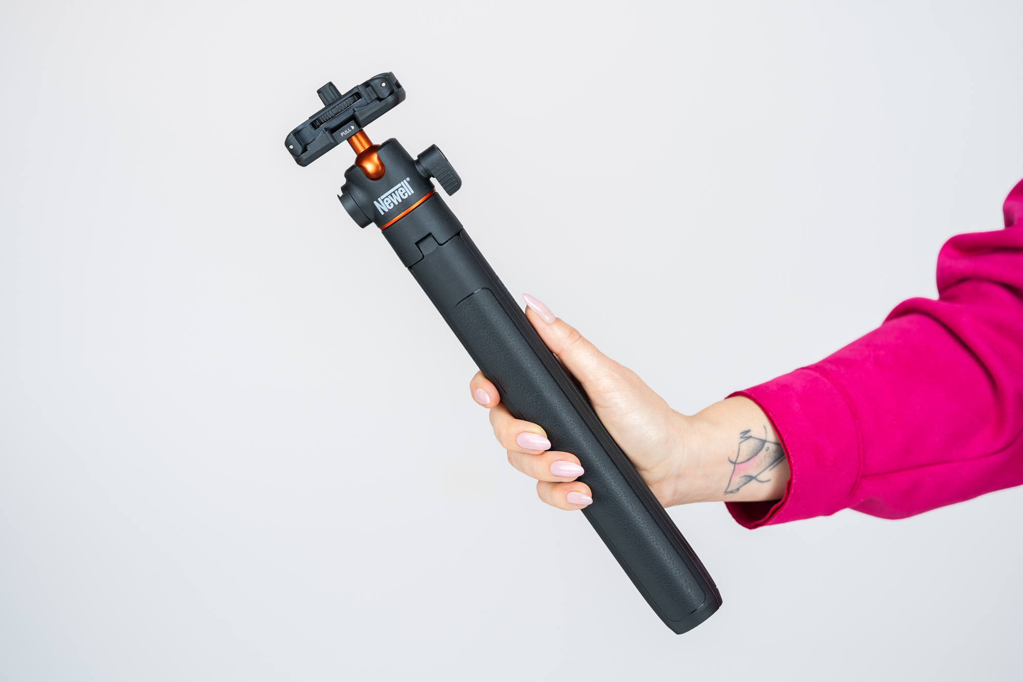 Po złożeniu nóg statyw Newell z funkcją monopodu M-Pod zamienia się w wygodny uchwyt do pracy z ręki. Antypoślizgowe okładziny poprawiają kontrolę, a konstrukcja lepiej leży w dłoni – zwłaszcza gdy nagrywasz dłużej, przemieszczasz się albo pracujesz w rękawiczkach. Dzięki temu to właśnie monopod, a nie statyw, staje się naturalnym wyborem do ujęć w ruchu, gdy liczy się szybka reakcja i mobilność.
