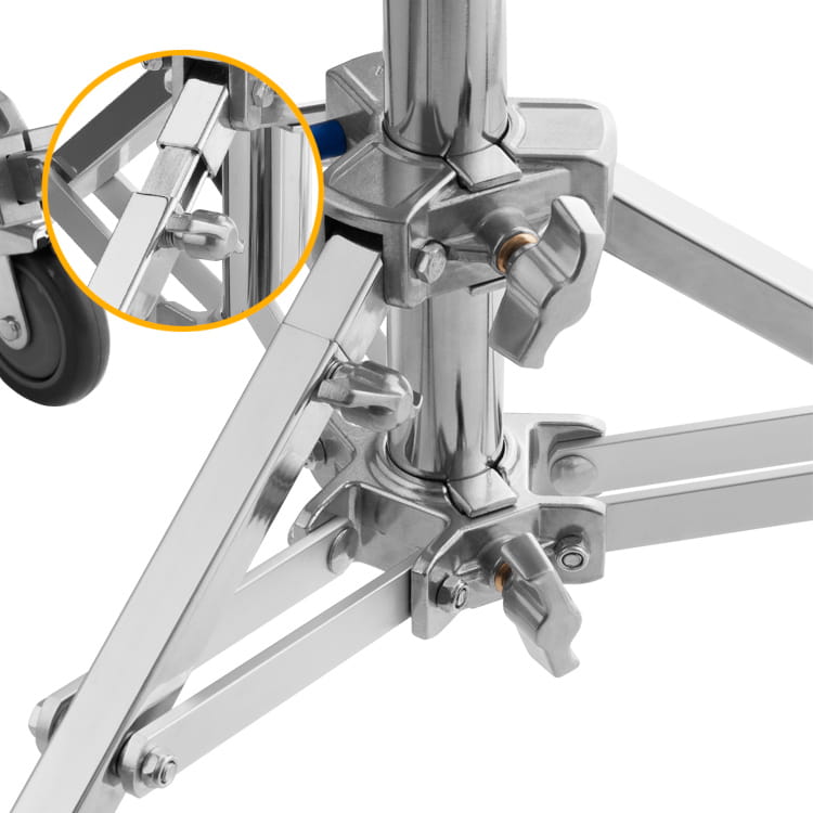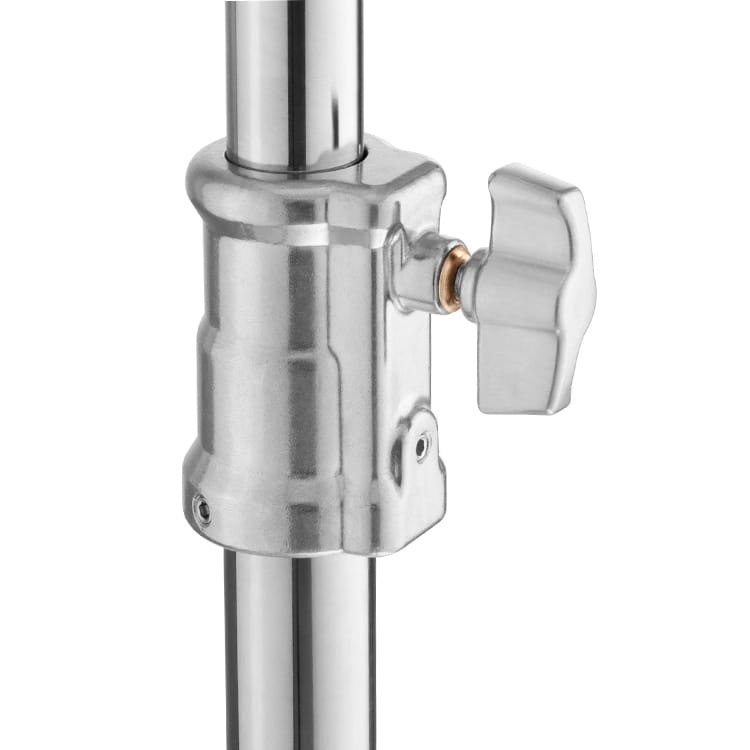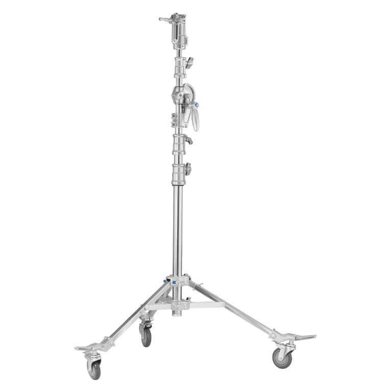 Profesjonalny metalowy statyw oświetleniowy z boomem o wysokości maksymalnej 3,98m i udźwigu do 10kg. Ramię boomu składa się do środka kolumny centralnej, co znacznie upraszcza i przyśpiesza rozkładanie statywu do pracy. Nogi, kolumna centralna oraz boom wykonane są z solidnych rur stalowych, natomiast łączniki, zaciski segmentów i inne elementy są odlewami aluminiowymi. Szeroki rozstaw nóg (100cm) zapewnia dobrą stabilność statywu nawet przy dużym obciążeniu. Jedna z nóg statywu ma możliwość regulacji długości w zakresie 9,5cm, co ułatwia np. wypoziomowanie statywu na pochyłej powierzchni. Kółka mają możliwość regulacji położenia, co też pozwala lepiej dostosować statyw do własnych potrzeb. Wszystkie kółka są wyposażone w hamulec.