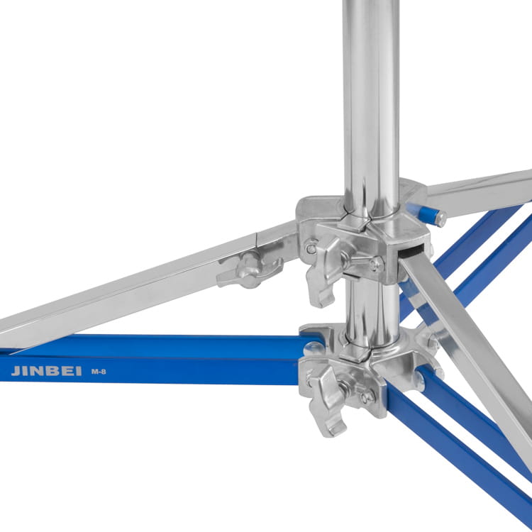 Metalowy statyw oświetleniowy typu boom Jinbei M8 o wysokości maksymalnej 5,3m i udźwigu do 30kg znajdzie swoje zastosowanie w każdym profesjonalnym studio. Ramię boomu składa się do środka kolumny centralnej, co ułatwia rozkładanie statywu do pracy. Wykonane ze stali nierdzewnej boom, nogi oraz kolumna centralna statywu zapewniają maksymalną stabilność i wytrzymałość. Wszystkie łączniki oraz zaciski i mocowania trzpienia są wykonane z odlewanego stopu aluminium. Szeroki rozstaw nóg statywu (144 cm) daje gwarancję stabilnej pracy nawet przy maksymalnym obciążeniu. Jedna z nóg statywu ma możliwość regulacji długości w zakresie 11 cm, co ułatwia np. wypoziomowanie statywu na pochyłej powierzchni. Kółka wyposażone w hamulec mają możliwość regulacji położenia, co też pozwala lepiej dostosować statyw do własnych potrzeb. Boom ma wbudowany trzpień 16mm, który można ustawić równolegle do osi ramienia, poprzecznie, lub schować, gdy nie jest potrzebny. Obok trzpienia znajduje się także gniazdo w standardzie ARRI. Wszystkie segmenty kolumny mają wbudowane sprężynowe amortyzatory, zabezpieczające zamocowany sprzęt przed uszkodzeniem przy przypadkowym zwolnieniu zacisku.